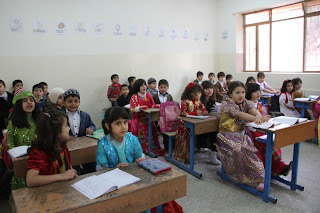 A Classroom with pupils all wearing traditional Kurdish clothes (Xendan)